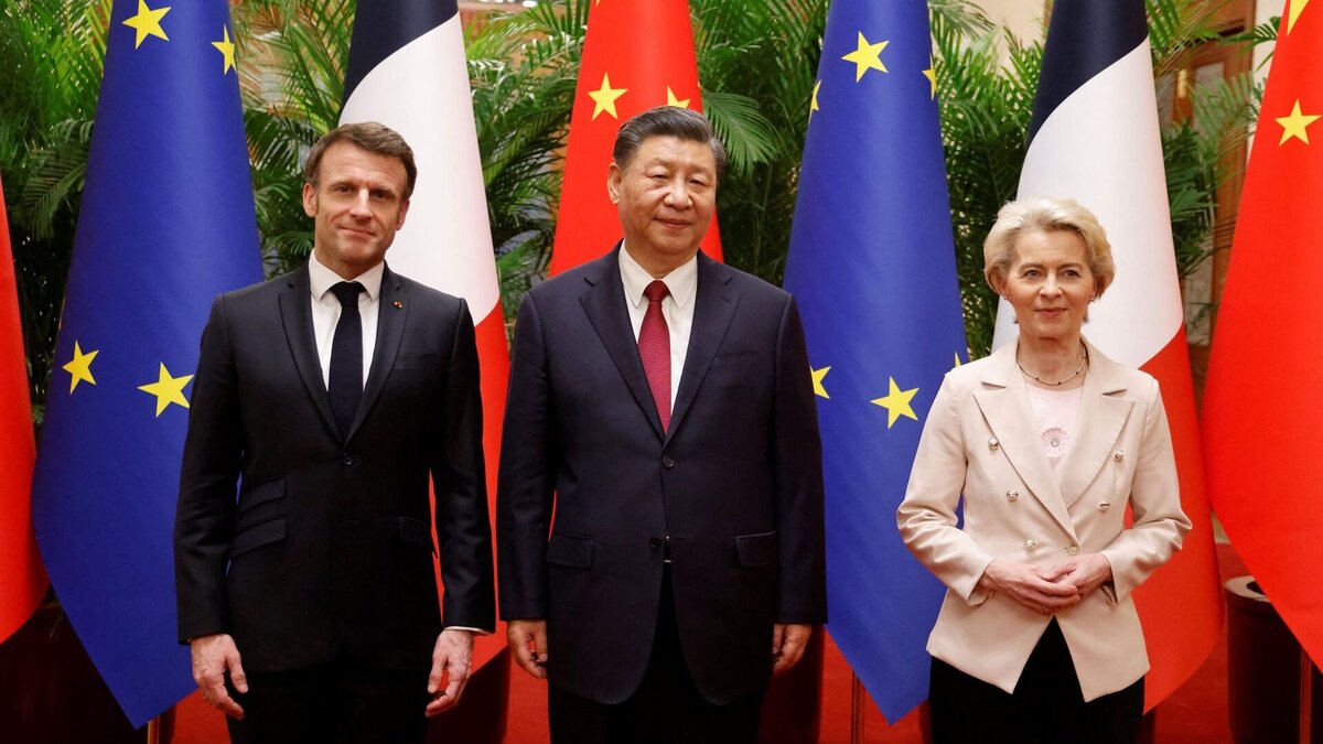 Эммануэль Макрон, Си Цзиньпин и Урсула фон дер Ляйен, 2023. Фото: Ludovic Marin / AFP
